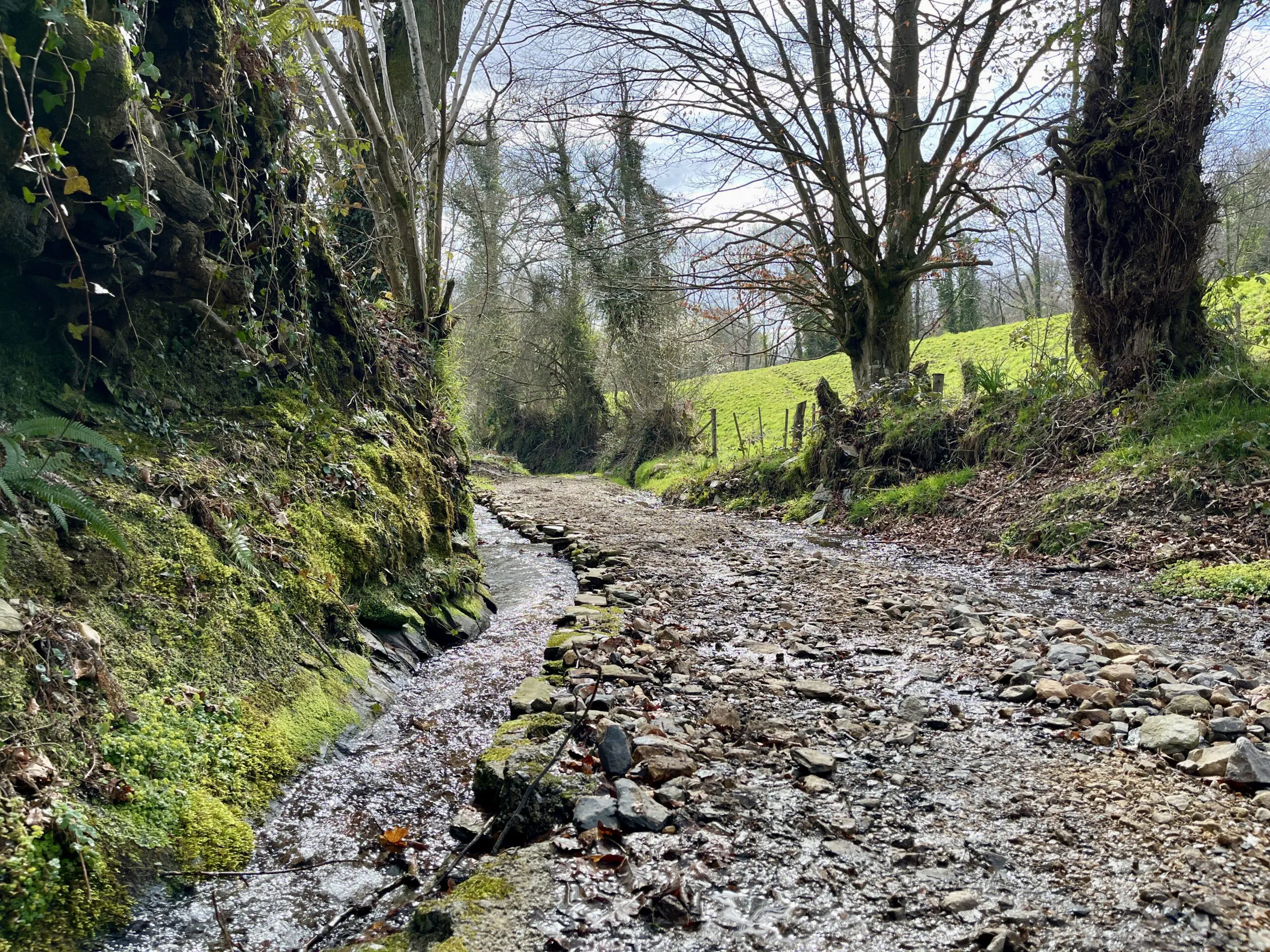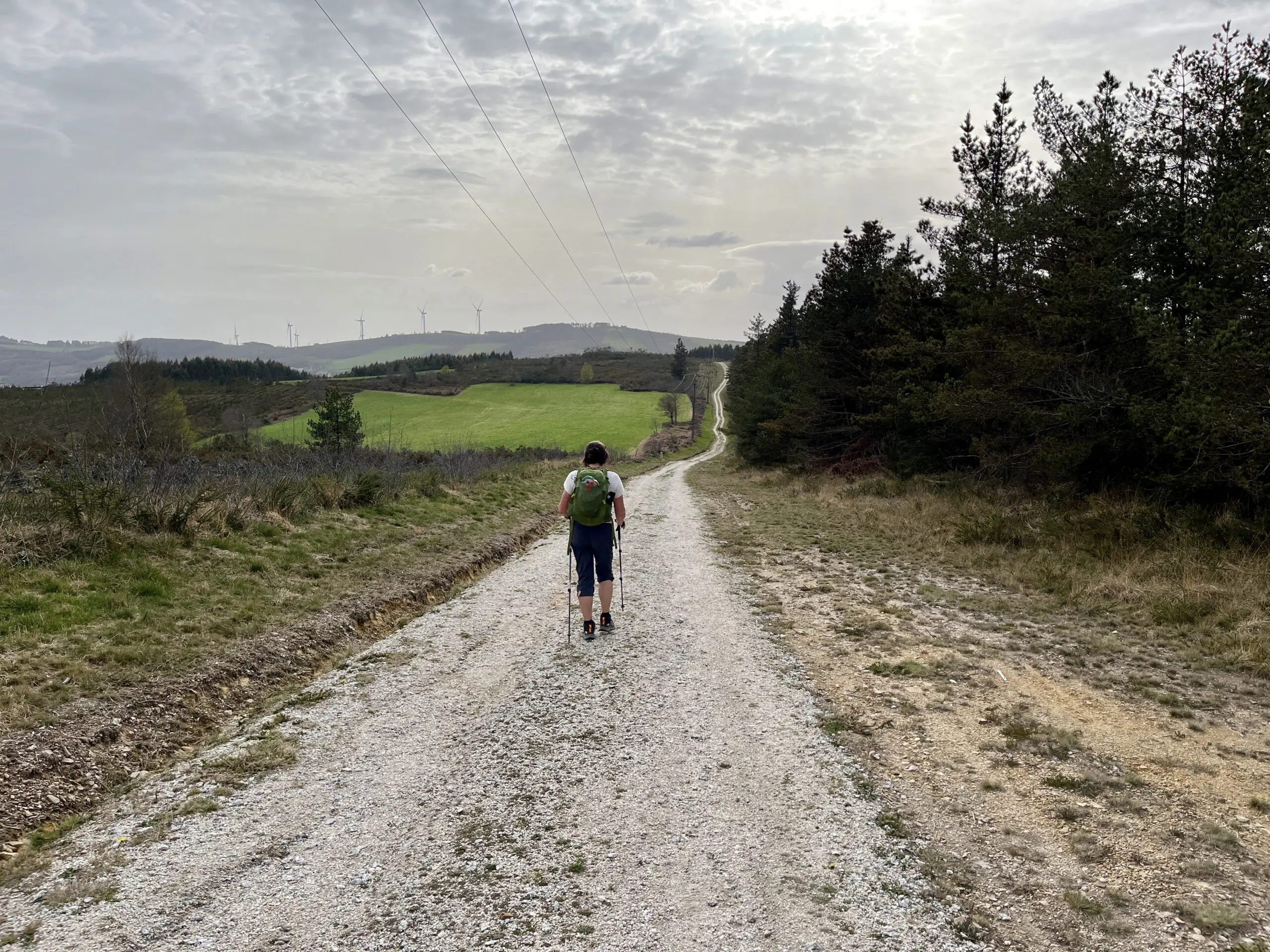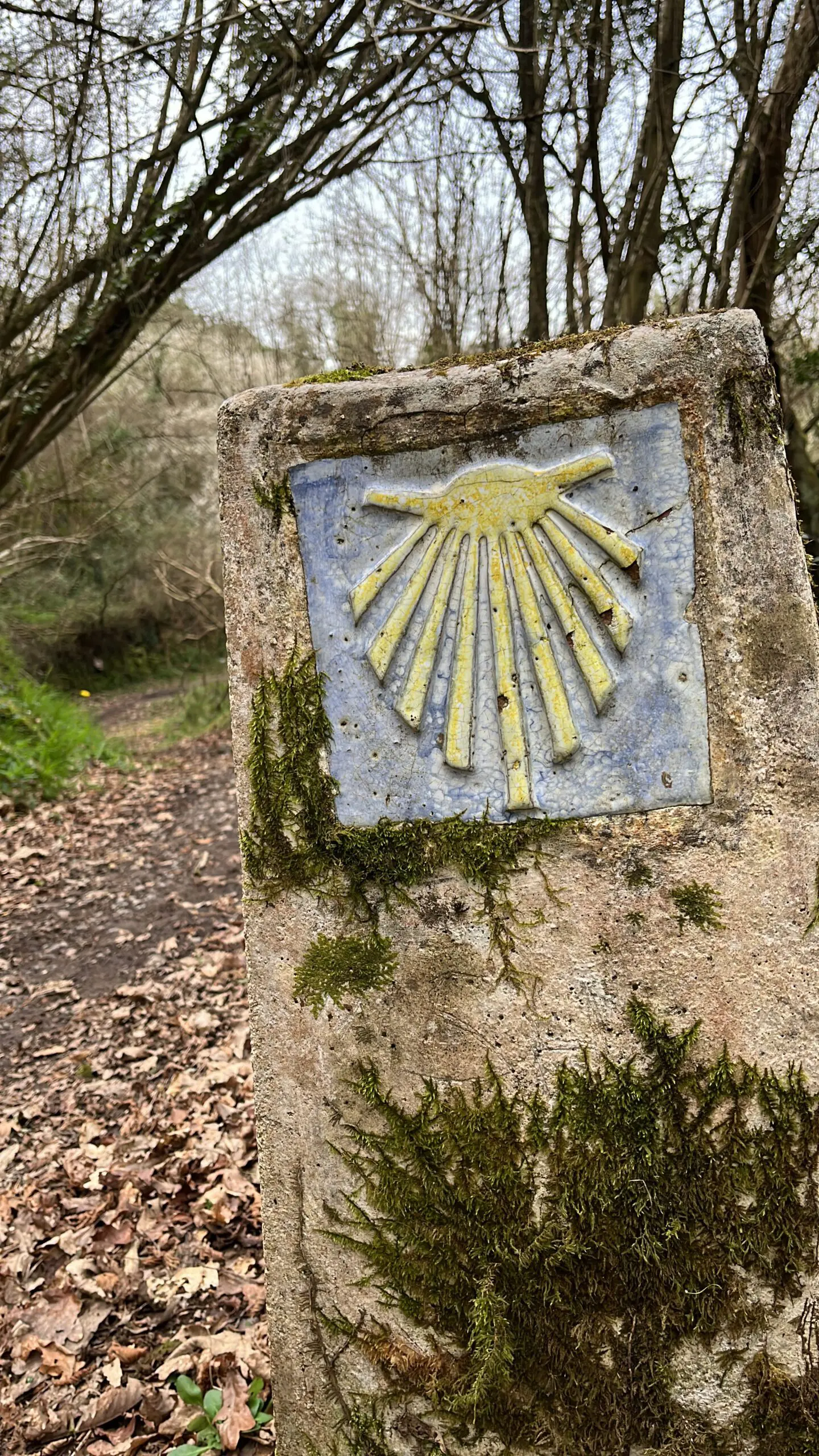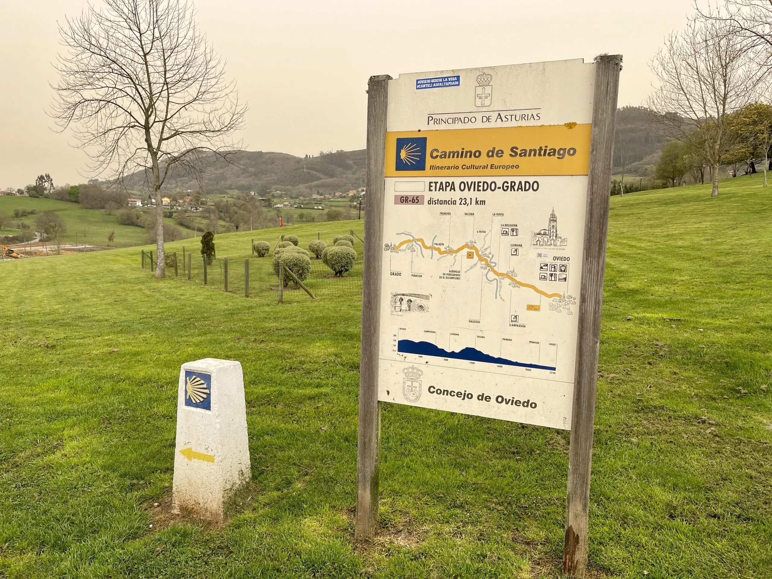 Eenmaal buiten Oviedo werden we begeleid door de welbekende granieten mijlpalen met de gestileerde schelpen die de richting aangaven. Ook de resterende afstand tot Santiago de Compostela is erop vermeld. Dit eenvoudige, overvloedige en dus effectieve systeem gaf ons een geruststellend gevoel. Er waren er zoveel dat we geen routekaarten nodig hadden. Uit interesse gebruikten we wel een route-app (GaiaGPS) om onze sporen vast te leggen – zo kunnen we nu nog steeds zien op de kaart waar we hebben gelopen en waar we hebben uitgerust. Een stukje geschiedschrijving.