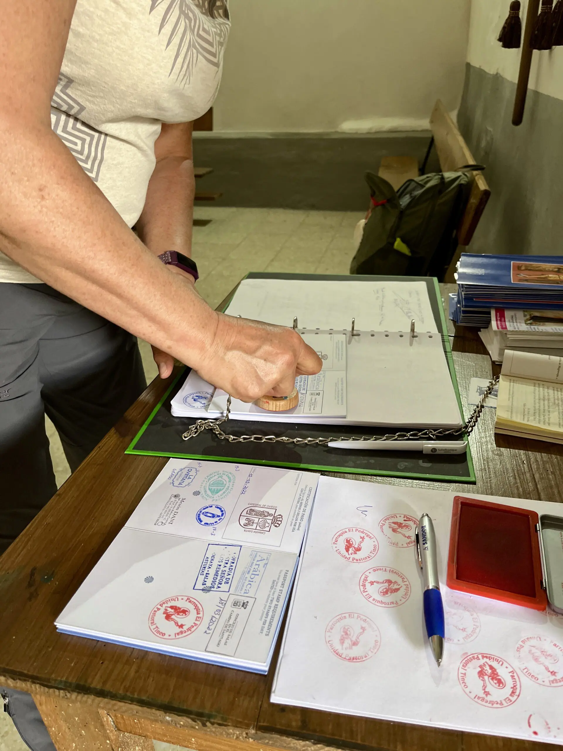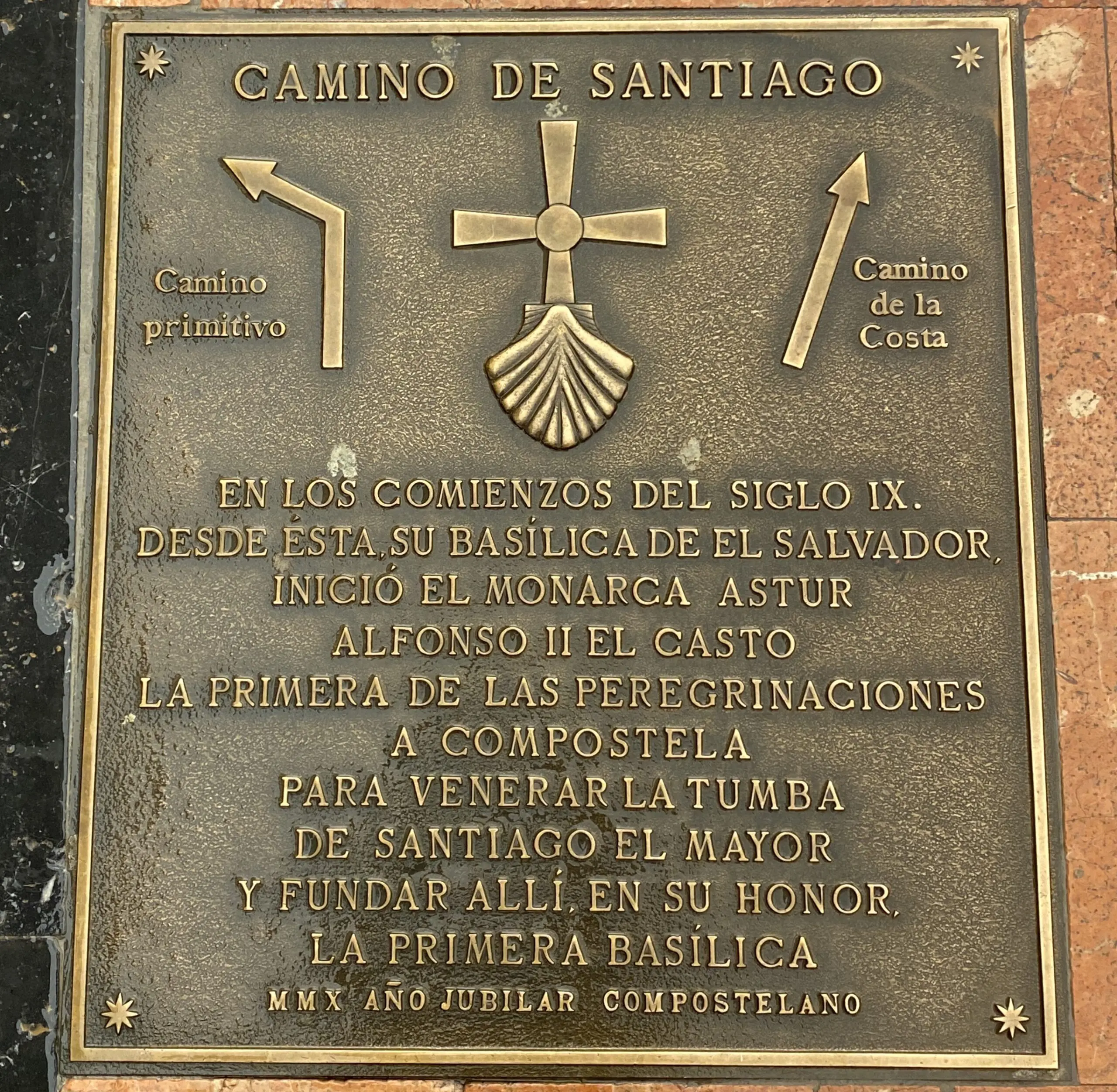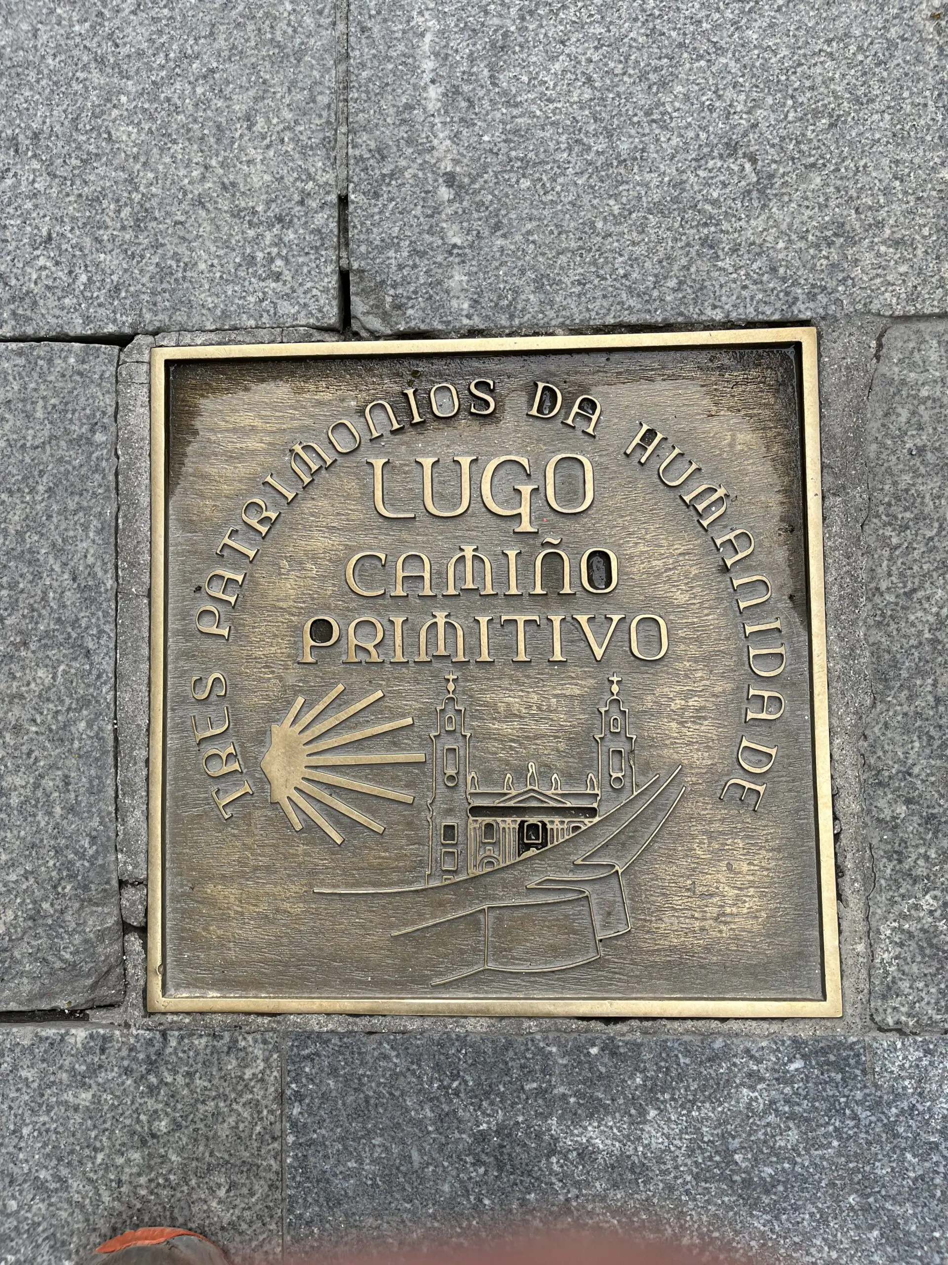 In de kathedraal van San Salvador kochten we onze pelgrimspaspoorten (credencial) en schelpen. We kregen er meteen onze eerste stempel, een symbolische start van onze reis. Via de messing schelpen in de bestrating liepen we terug naar ons hotel wat 600 meter verderop langs de route lag. En zo hoefden we de volgende ochtend ook alleen maar onze rugzakken om te hangen, de deur uit te stappen en linksaf te slaan. We waren gestart. Ook de route de stad uit was eenvoudig te volgen dankzij de messing schelpen.
