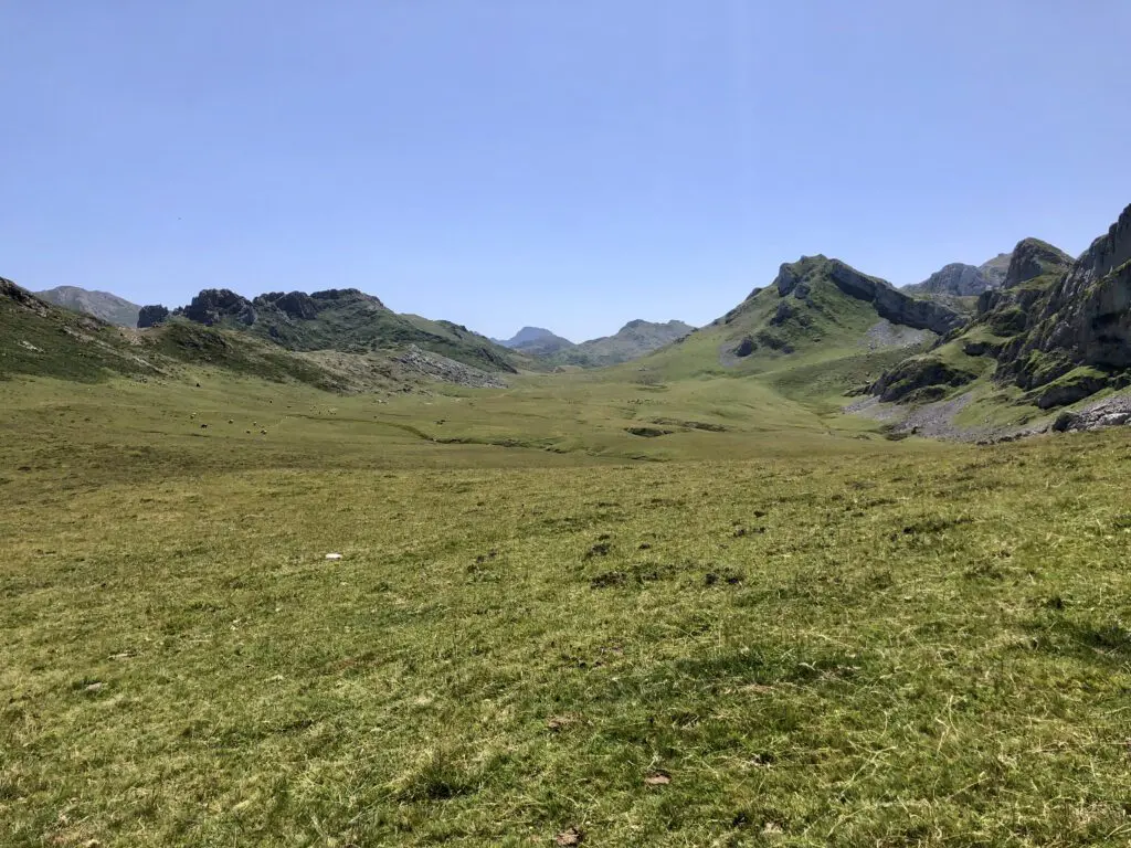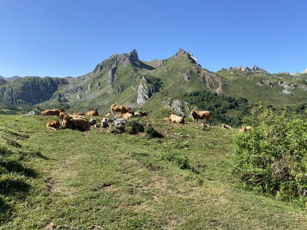 Vanaf hier lijkt het even op een wandeling in Schotland met de groene grazige hoogvlaktes tussen rotsachtige bergtoppen. Op deze brañas grazen koeien die daar in verschillende kuddes rondlopen om het goede gras te bemachtigen en fris water in beekjes te vinden. Er zijn geen hekken. En je droomt al wandelend weg naar hoe het leven hier honderden jaren geleden moet zijn geweest voor herders met hun koeien.