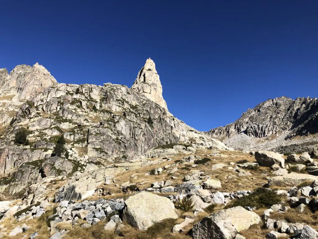 We komen aan bij berghut Refugi d’Amitges, gelegen bij twee meren en genoemd naar de scherpe rotspunt op de bergrug erachter. En inmiddels laten we de laatste bomen achter ons en blijven er slechts rotsen en gras over.