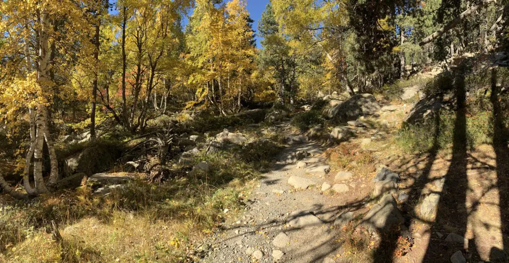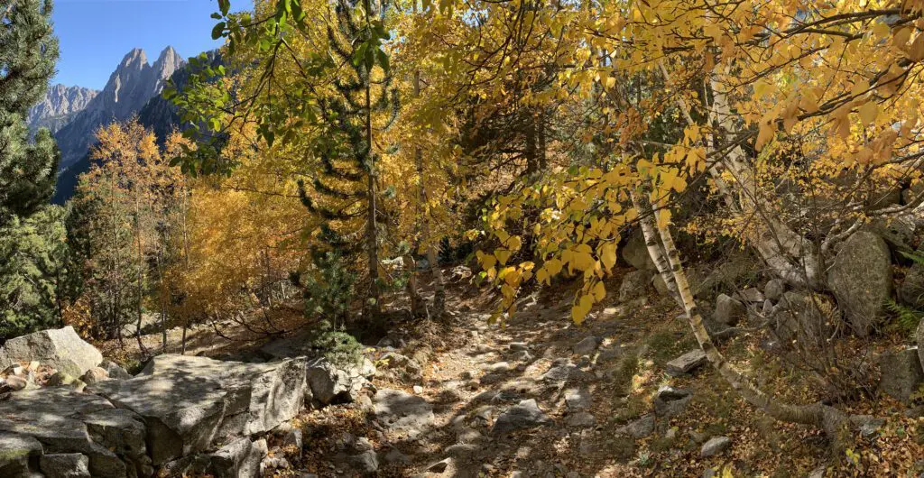 Na de lunch dalen we af naar Mirador de l’Estany, van hieruit kunnen we het dal in de volle lengte zien met het meer van Sant Maurici en de twee markante toppen van Els Encantats. We steken nog een aantal hellingen met grote keien over. Het uitzicht is prachtig. Hierna komen we in het bos terecht aan de zuidzijde van het dal. We lopen langs de voet van Els Encantats en langs het meer van Sant Maurici weer terug naar de parkeerplaats. Een prachtige tocht. En op het juiste moment voor de ultieme herfstkleuren.