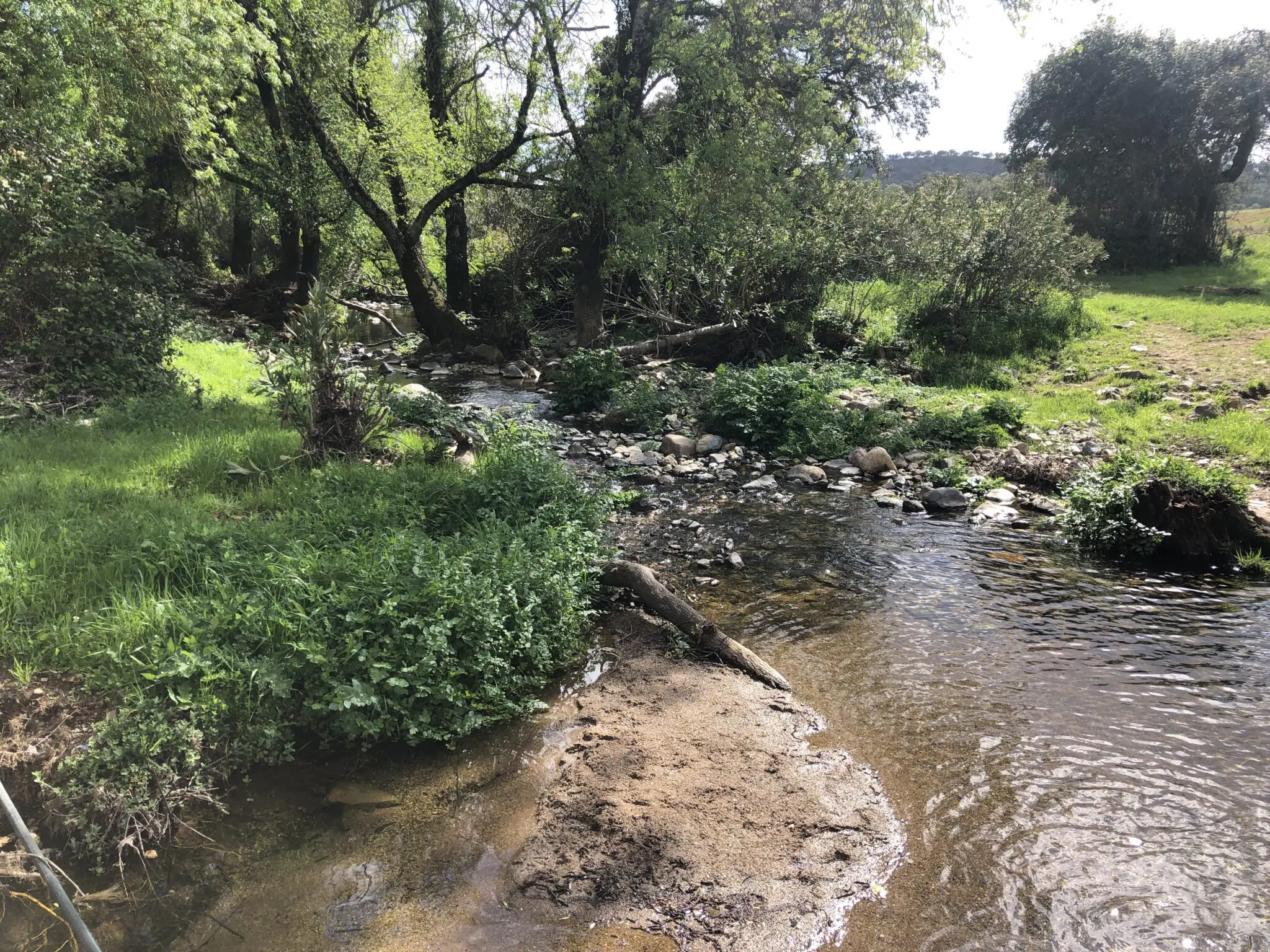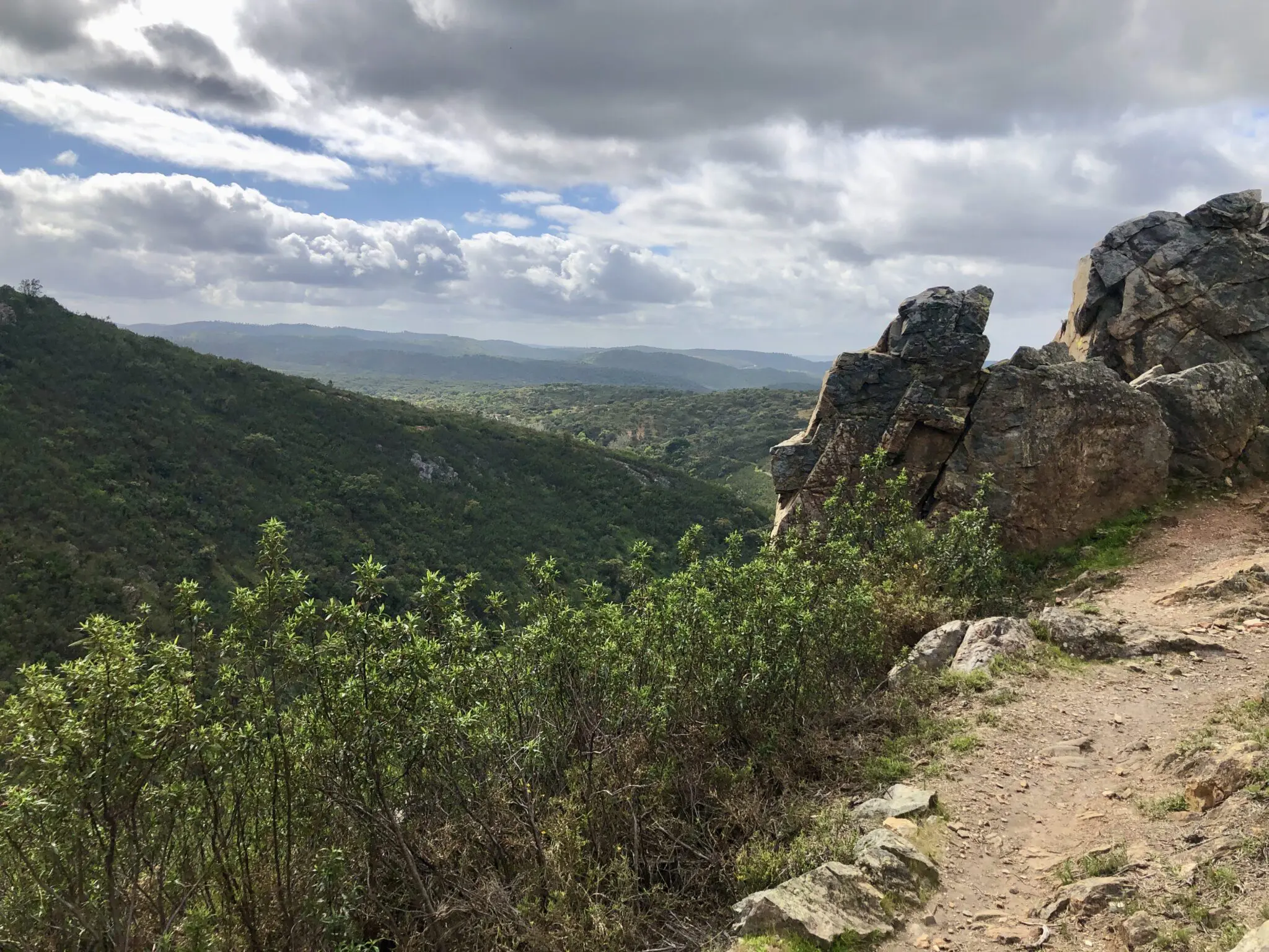Vervolgens kwamen we in een heel ander landschap, een vallei uitgesleten door de Rivera de Alájar. Lopend over de smalle paadjes langs de rotsen daalden we na verloop van tijd af naar een lager gelegen deel met weer opnieuw ruime boomgaarden met olijfbomen en kurkeiken.